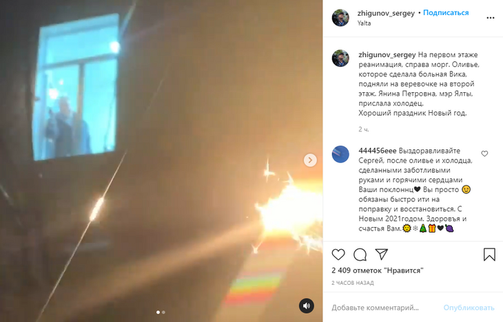 «На первом этаже реанимация, справа морг. Оливье, которое сделала больная Вика, подняли на веревочке на второй этаж. Янина Петровна, мэр Ялты, прислала холодец. Хороший праздник Новый год», — порадовался актер в соцсетях.