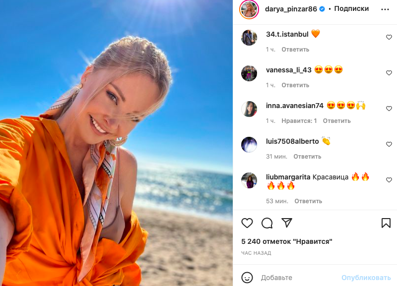 Сегодня она показала поклонникам фото, которое сделала на местном пляже. Блондинка погрелась на солнце в тонком бежевом топе без бюстгальтера. Сверху майки Дарья набросила ярко-оранжевую рубашку.