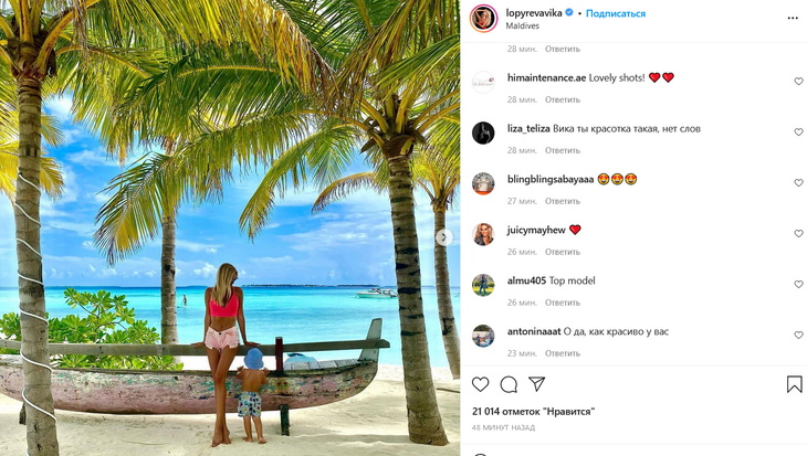 На одном из фотоснимков Лопырева с наследником запечатлены на Мальдивах возле большой лодки.