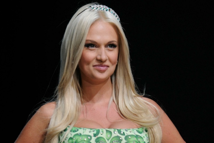 Блондинка одета в красный топ и белые мини-шорты. Наряд прекрасно подчеркивает бронзовый загар длинноногой модели.