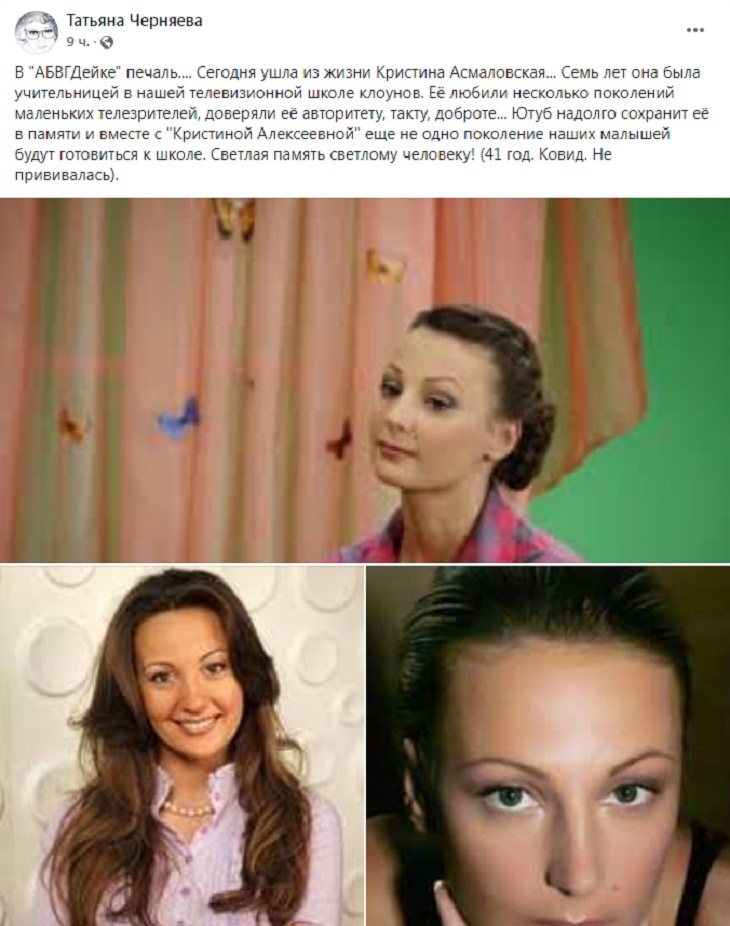 Ведущая «АБВГДейки» Татьяна Черняева в своих соцсетях поделилась печальной новостью. От коронавируса умерла ее коллега по популярному детскому проекту, 41-летняя телеведущая Кристина Асмаловская.