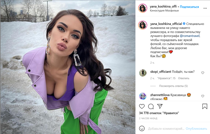 «Cпециально выманила на улицу нашего режиссера и лучшего фотографа, чтобы порадовать вас яркой фоткой. Люблю вас, мои дорогие подписчики!» — призналась Кошкина.