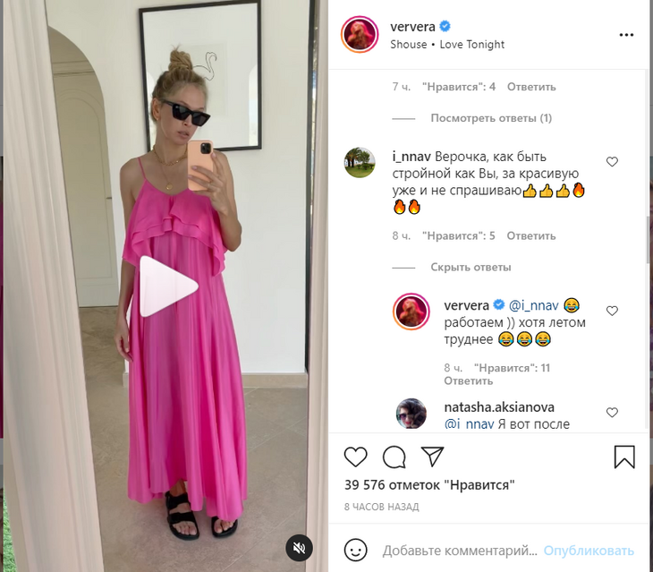 «Верочка, как быть стройной, как вы, за красивую уже и не спрашиваю», — написала в комментарии одна из подписчиц. Брежнева не оставила вопрос без ответа, пояснив, что поддерживать себя в форме ей помогает работа.