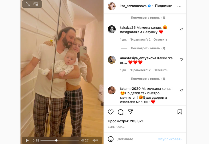 «Мамина копия! Поздравляем Левушку»; «Какая замечательная семья»; «Мамочкина копия! Но детки так быстро меняются ! Будь здоров и счастлив, малыш»; «Так подрос уже, богатырь», — написали они.