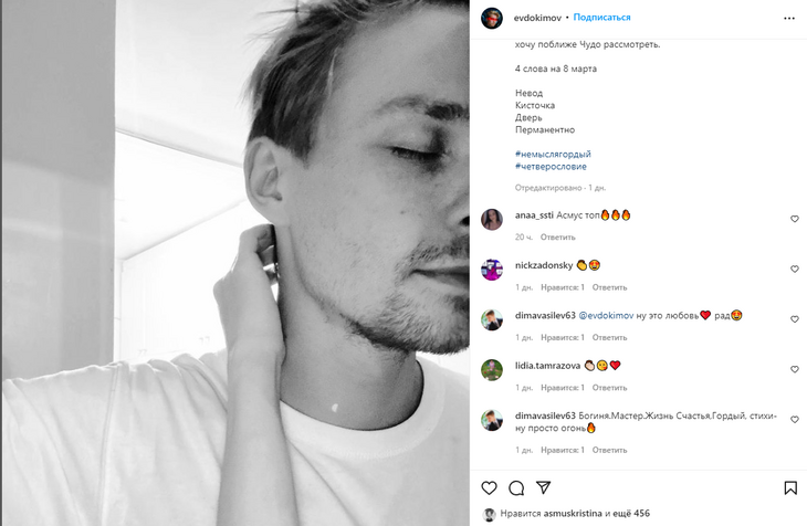В комментариях тут же решили, что таким образом Евдокимов обратился именно к Асмус. «Ну, это просто любовь. Рад», «Асмус топ», «Богиня. Мастер. Жизнь счастья. Гордый, стихи — ну просто огонь», — написали подписчики.