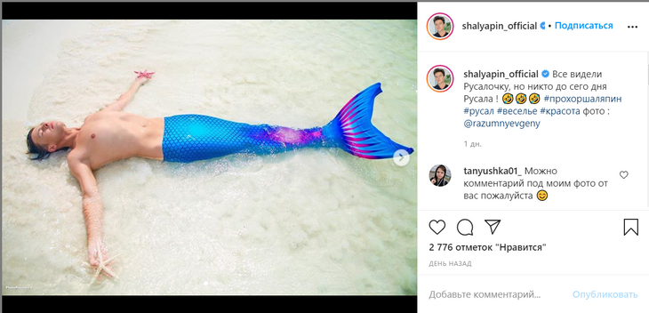 Певец и телеведущий Прохор Шаляпин в своем Инстаграм выложил снимки, на которых он позирует в образе «русала» с обнаженным торсом и голубым хвостом.