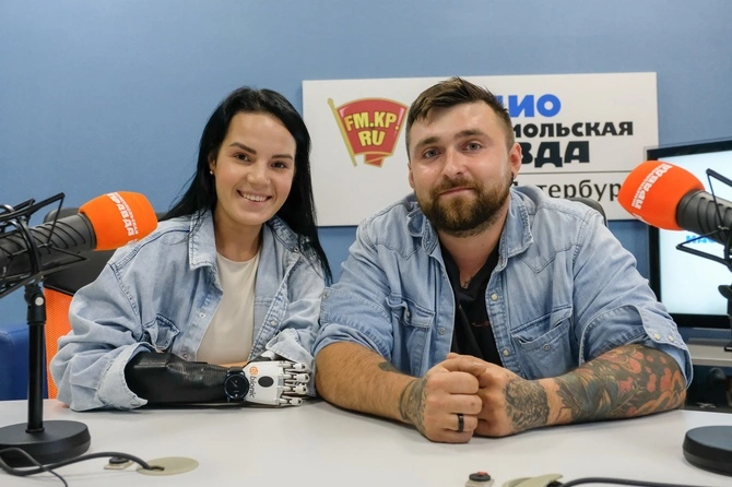 Маргарита Грачева, которой ревнивый муж отрубил кисти рук, со вторым мужем, петербургским строителем Максимом Андрющенко на радиостанции «Комсомольская правда».