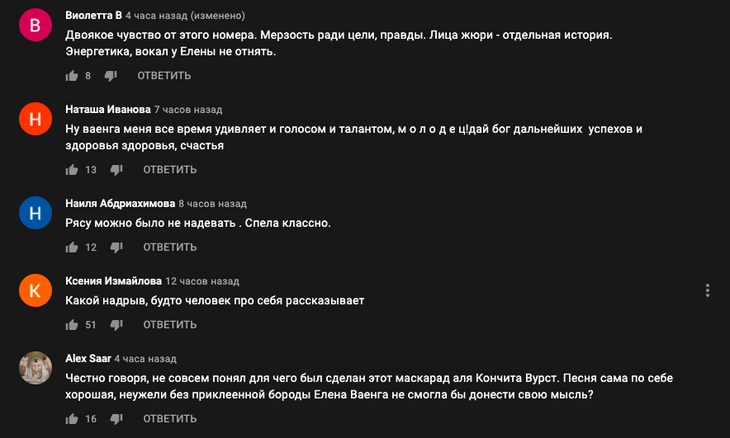 К слову, в комментариях на YouTube под записью шоу появилось несколько комментариев с аналогичной точкой зрения. Некоторые назвали образ певицы «мерзким», другие считают, что Елена Ваенга могла бы вполне обойтись без рясы.