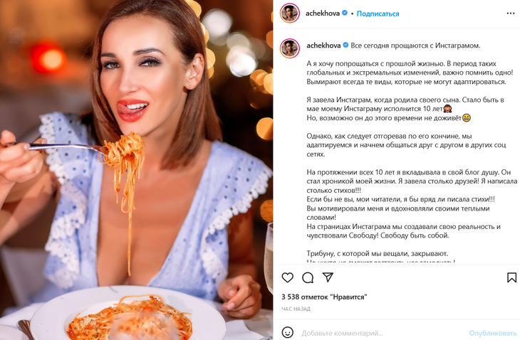 В качестве иллюстрации Чехова выбрала фото, сделанное в ресторане. Она сидит за столиком в голубом платье с глубоким вырезом на груди и ест спагетти.