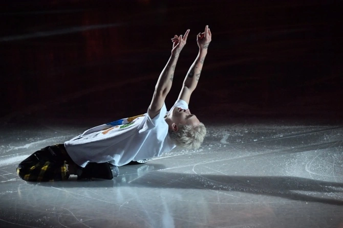 На этот раз фигурист из шоу «Ледниковый период» предстал в образе Снегурочки. Его ампула выдал новогодний наряд — коротенькая нарядная «шуба», голубая корона и длинная блондинистая коса.