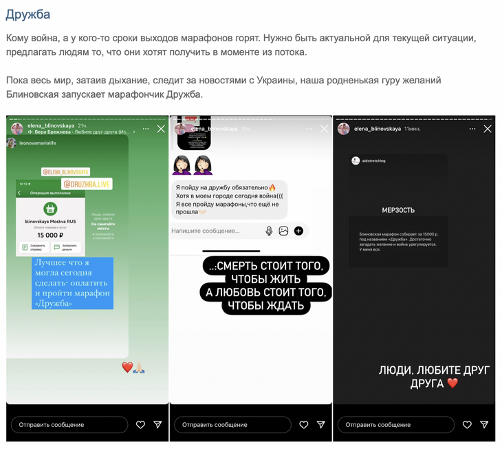 Пока весь мир, затаив дыхание, следит за новостями с Украины, наша родненькая гуру желаний Блиновская запускает марафончик "Дружба"», — недоумевает светский хроникер.