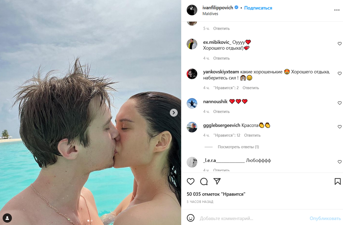 Актер Иван Янковский отдыхает вместе с Дианой Пожарской на Мальдивах. Внук легендарного Олега Янковского опубликовал в Instagram пляжные кадры с возлюбленной.