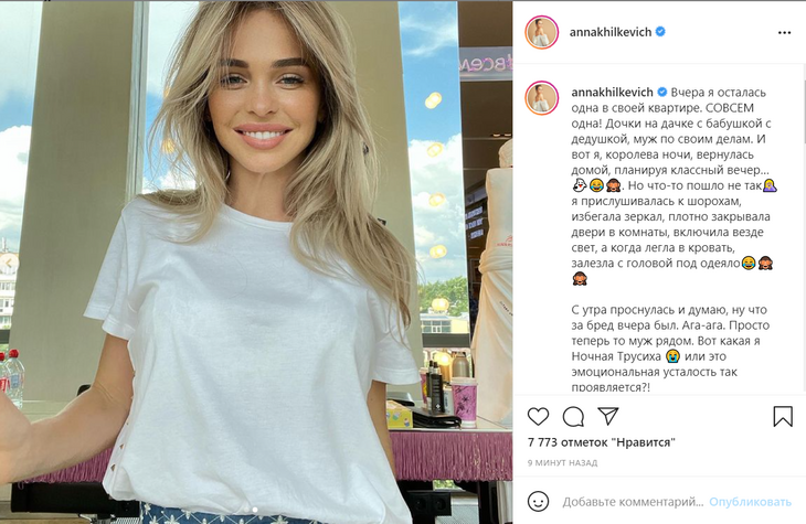 Об этом артистка рассказала в своем Instagram. По словам Хилькевич, накануне она осталась дома совершенно одна — детей отвезли на дачу к дедушке и бабушке, а муж уехал по своим делам.