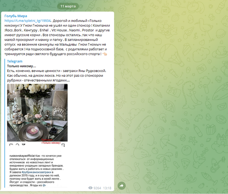 «Все спонсоры остались, так что наш малой прокормит и мамку, и папку. В запланированный отпуск на весенние каникулы на Мальдивы Гном Гномыч не собирается!» — написала Рудковская в своем Telegram-канале «Голубь мира».