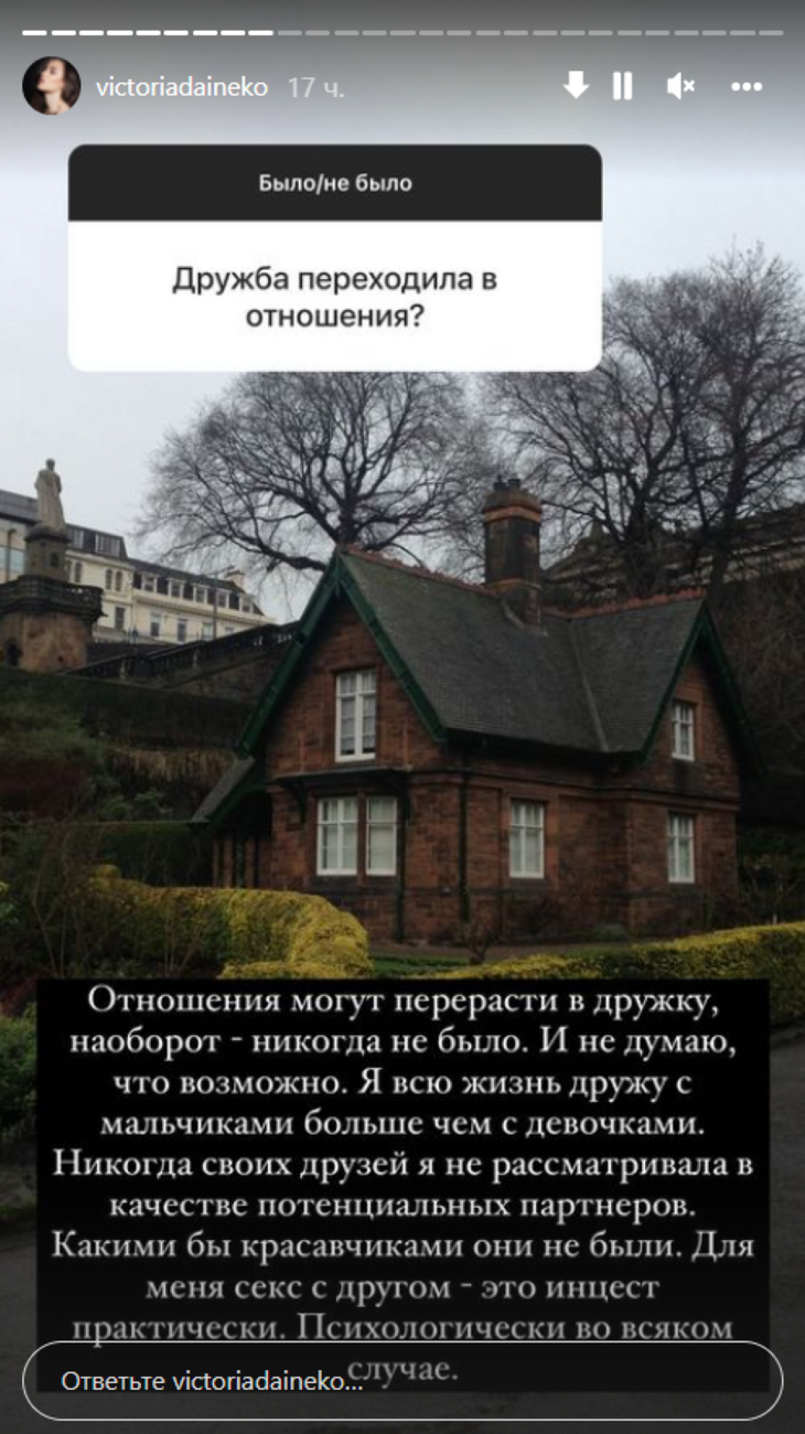 «Не думаю, что это возможно. Я всю жизнь дружу с мальчиками больше, чем с девочками. Никогда своих друзей я не рассматривала в качестве потенциальных партнеров. Какими бы красавчиками они не были. Для меня секс с другом — это инцест практически. Психологически, во всяком случае», — разоткровенничалась Виктория Дайнеко в своем микроблоге в Instagram.