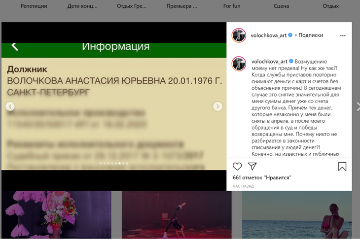 В четверг же, 27 августа, выяснилось, что финансы Волочковой поют романсы. Уже длительное время Анастасия числится в базе как должник.