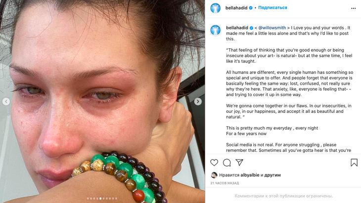 Супермодель опубликовала в своем Instagram несколько фотографий, на которых она плачет. Белла Хадид добавила, что проблемы с психикой похожи на американские горки, когда положительные моменты бывают спустя недели и месяцы «падений».