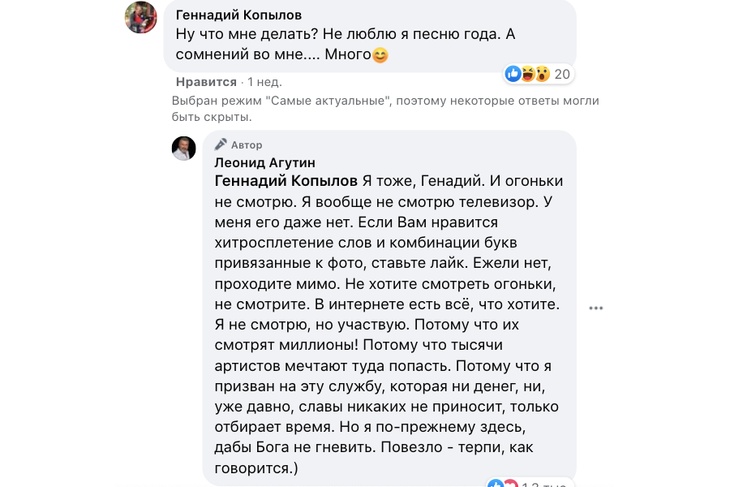 Леонид Агутин написал в своем Facebook, что уже снялся в «Голубом огоньке». Несколько пользователей высказались в комментариях, что не любят эти новогодние шоу со звездами. Агутин ответил, что и сам не смотри телевизор, но всегда участвует в «огоньках».