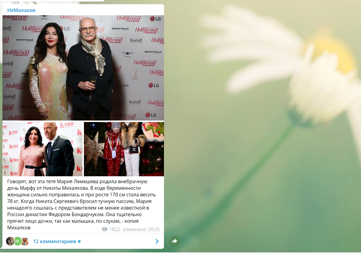 Так, Telegram-канал «НеМалахов» разместил фотографию Михалкова с некой брюнеткой. Отмечалось, что женщина родила Никите дочь, которую назвали Марфой. После беременности избранница якобы сильно поправилась, из-за чего Михалков продолжать с ней отношения не захотел.
