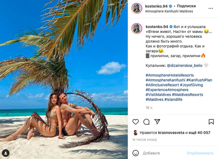Анастасия Костенко в третий раз стала мамой всего три месяца назад, однако уже улетела с новорожденным малышом в отпуск. Модель вместе с мужем Дмитрием Тарасовым и двумя дочками отправилась на Мальдивы.