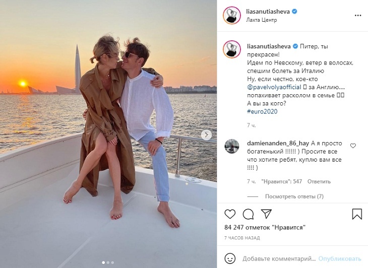 «Идем по Невскому, ветер в волосах, спешим болеть за Италию. Ну, если честно, кое-кто за Англию….» — написала под красивыми снимками гимнастка, указывая на супруга. И заявила: «Попахивает расколом в семье! А вы за кого?»
