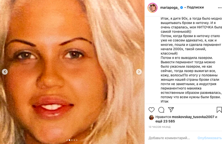 Мария отметила, что, как истинное «дитя 90-х», долгое время старательно выщипывала брови в тонкую ниточку. Потом пришли нулевые, и модницы переключились на татуаж.