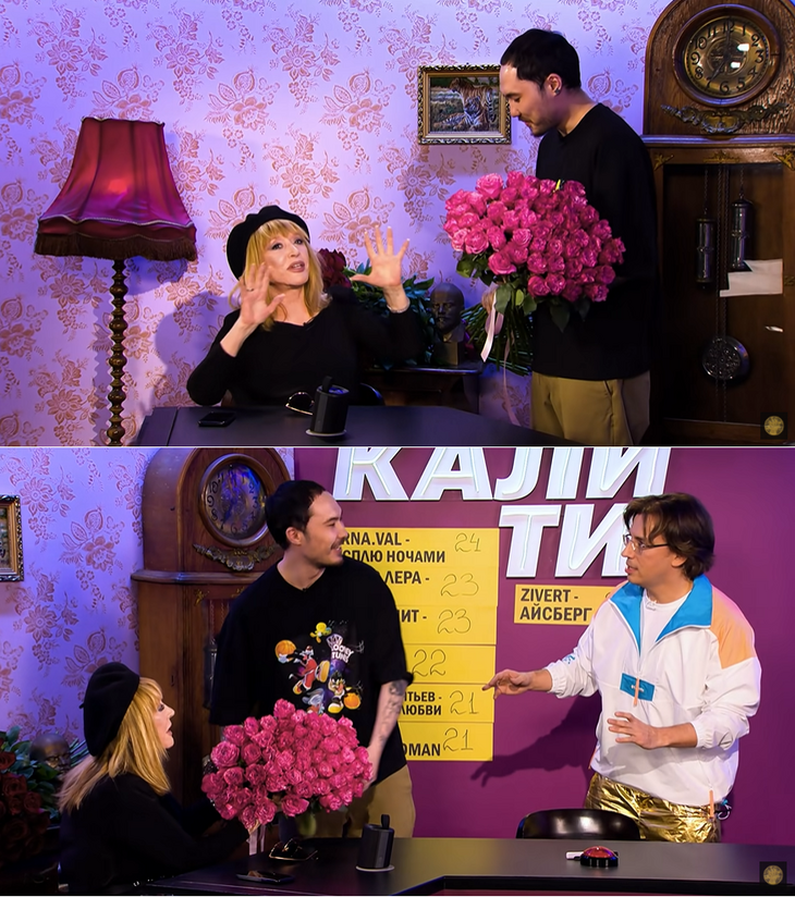 Каково было удивление поп-дивы, когда сам Скриптонит появился в студии, чтобы лично поздравить свою новоиспеченную фанатку. Музыкант презентовал артистке шикарный букет розовых роз, а Пугачева с кокетливой улыбкой приняла от него подарок и трогательно поблагодарила артиста.