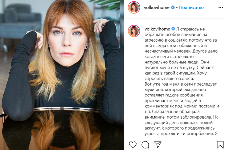 «Вот уже год меня в сети преследует мужчина, который ежедневно оставляет гадкие сообщения, проклинает меня и людей в комментариях под моими постами и т.п. Сначала я не обращала внимание, потом заблокировала. На следующий день появился новый аккаунт, с которого продолжились угрозы, проклятия и оскорбления», - пишет Екатерина Волкова.